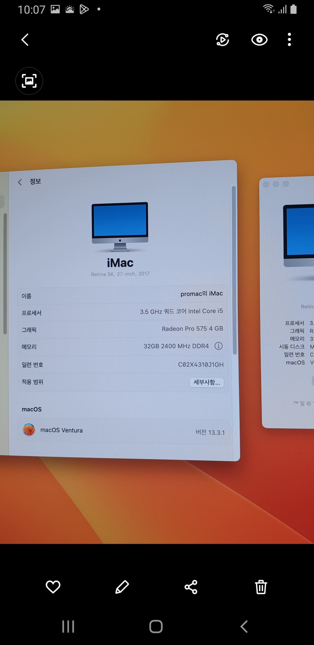 화면이 완전 새거같은 2017년 레티나 5k 아이맥 27인치입니다